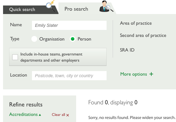 It certainly appeared to be the tipping point for Emily Slater: She and Cohen Cramer parted company and, according to information given to me, she had moved abroad to Vienna. Miss Slater no longer shows up on a search of the Law Society’s solicitor database (see screenshot below) and, until she removed her LinkedIn profile a few months ago, was seemingly unemployed. Another high profile victim of Miss Slater’s unethical approach to her professional calling, Lincolnshire businessman Mr Stuart Brown, reported on his weblog that she had been dismissed by Cohen Cramer at the end of January 2015 (read more here), a claim the law firm denies.
