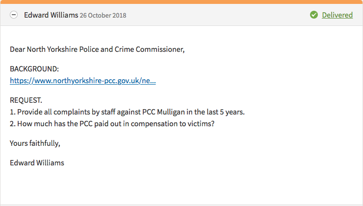 On 26th October, 2018, Mr Williams made a simple, plainly expressed request to the PCC’s office via the What Do They Know website: