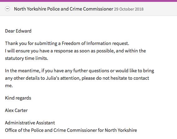 Holly does not say whom the ‘relevant person’ is. Or explain why this request, as are all others to North Yorkshire Police and Crime Commissioner, was not being dealt with by the specialist disclosure officers in the Civil Disclosure Unit (CDU), headed up by a police lawyer. It can be plainly inferred that the CDU had not been involved up to this point.