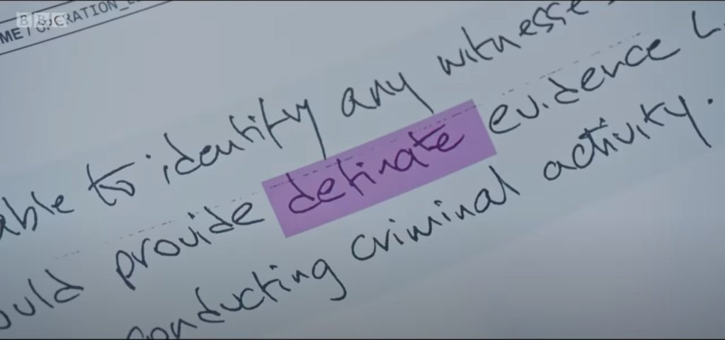 This is a publicity pic released by the BBC. The mis-spelling of ‘definate’ or ‘definately’ has always been put forward as a big clue to discovering the identity of ‘H’ or the fourth man (or woman). It has been seen at least twice in messages from the OCG’s Mr Big – and used by Ted Hastings once.