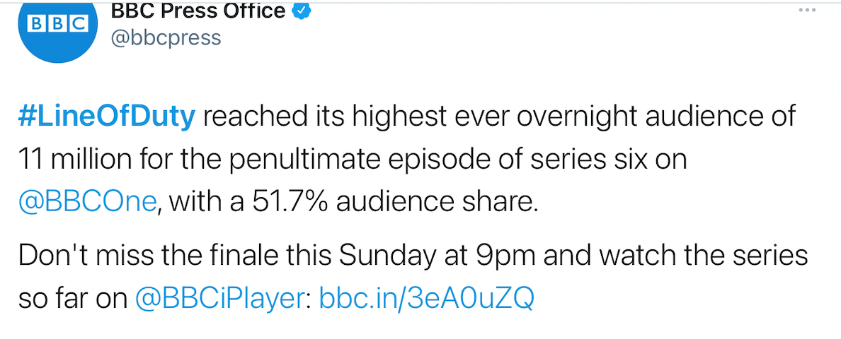 (ii) She answered ‘no comment’ on 33 occasions. Plus, when Ted insisted she tell him who ultimately gives the OCG orders, she said something along those lines, but altogether more startling: ‘I can’t. I’m sorry’. But with each of those 34 reserved responses we learned a little more. Another tribute to the formidable writing skills of creator, Jed Mercurio.