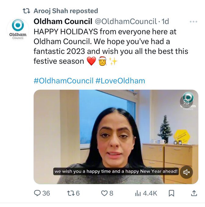 Cllr Arooj Shah, who claims to follow the Muslim faith devoutly and, for the next few months at least, heads up crisis-torn Oldham Metropolitan Borough Council, put out a seasonal greeting across the Council’s news and social media channels that deliberately excluded the word CHRISTMAS.