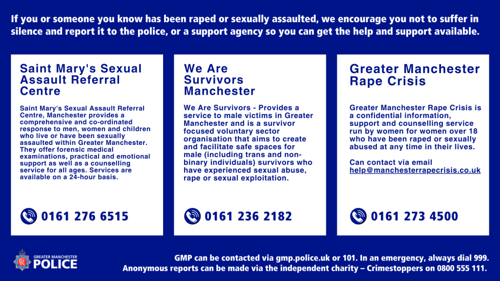 GMP can be contacted via gmp.police.uk or 101. In an emergency, always dial 999.