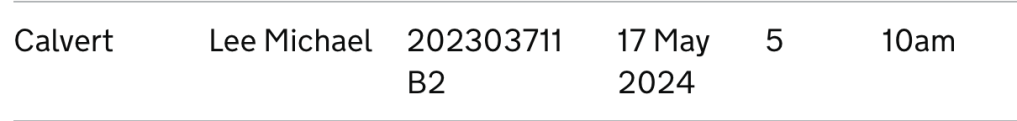 In a transparency data list updated earlier today (Friday 3rd May, 2024) by His Majesty’s Courts and Tribunals Service it was confirmed that a hearing of the second appeal against conviction of Lee Calvert is listed for 17th May, 2024 at the Royal Courts of Justice in London.