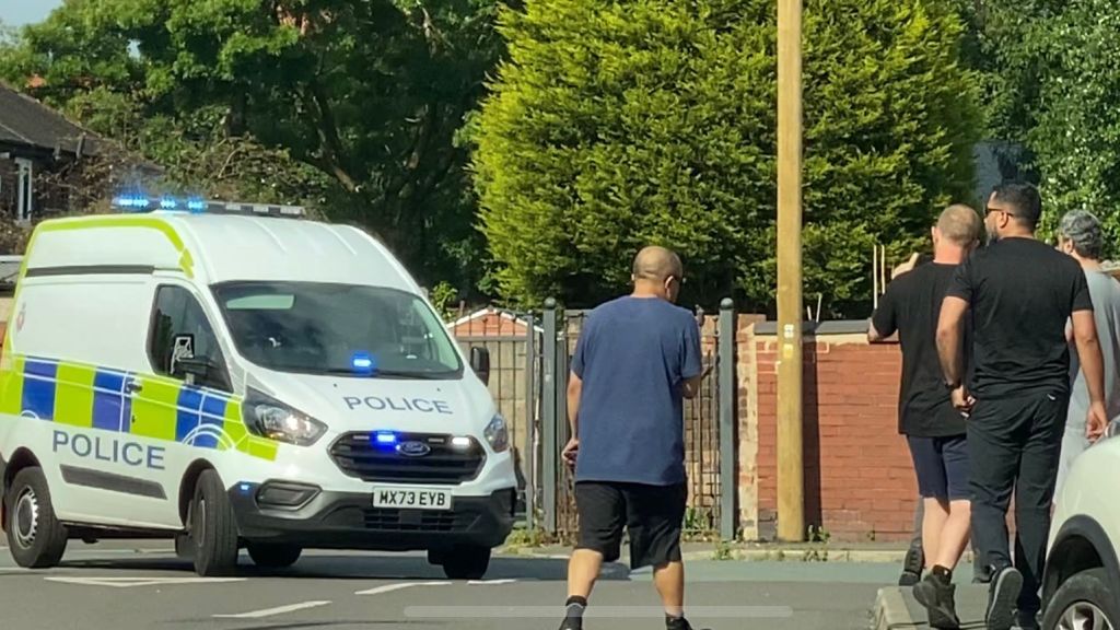 The group follow him, yelling ‘you’re not welcome in Oldham’.